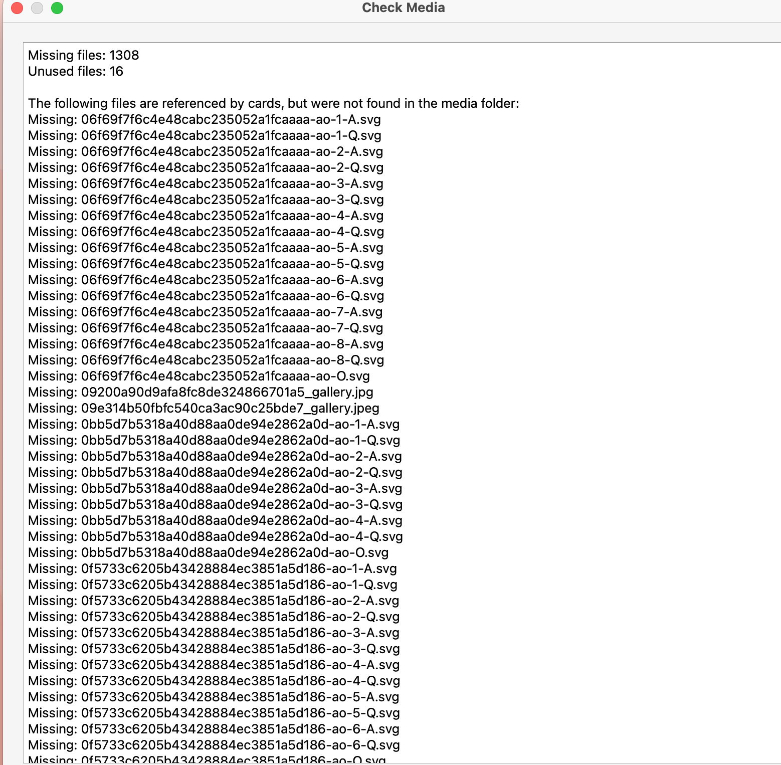 Are any of your decks shared decks that you can re-import the media for? [You don’t want to take the chance of the new import overwriting any of your edits or review history in the deck, so import the shared deck to a new (temporary) profile, then copy the contents of the collection.media folder to your main profile’s collection.media folder, and run a Check Media to see what helped.]