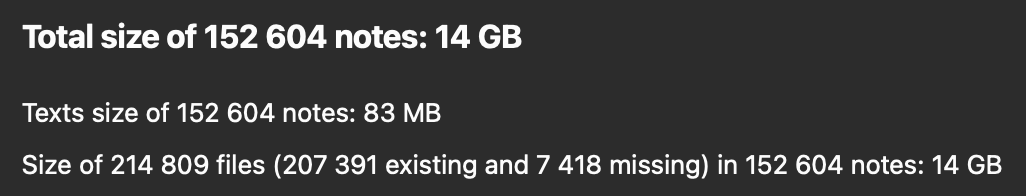 - I manually deleted ~40,000 cards (I 200,000 cards → 160,000), but this barely changed the total size. Probably all the cards i deleted were small in text data.