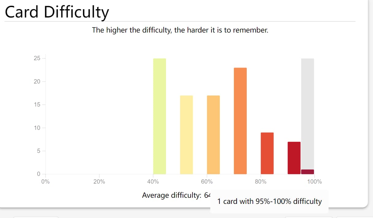 The “95% -100%” section of the card difficulty chart does not include the number of cards with a difficulty of 100%. The chart shows one, but I clicked in four.