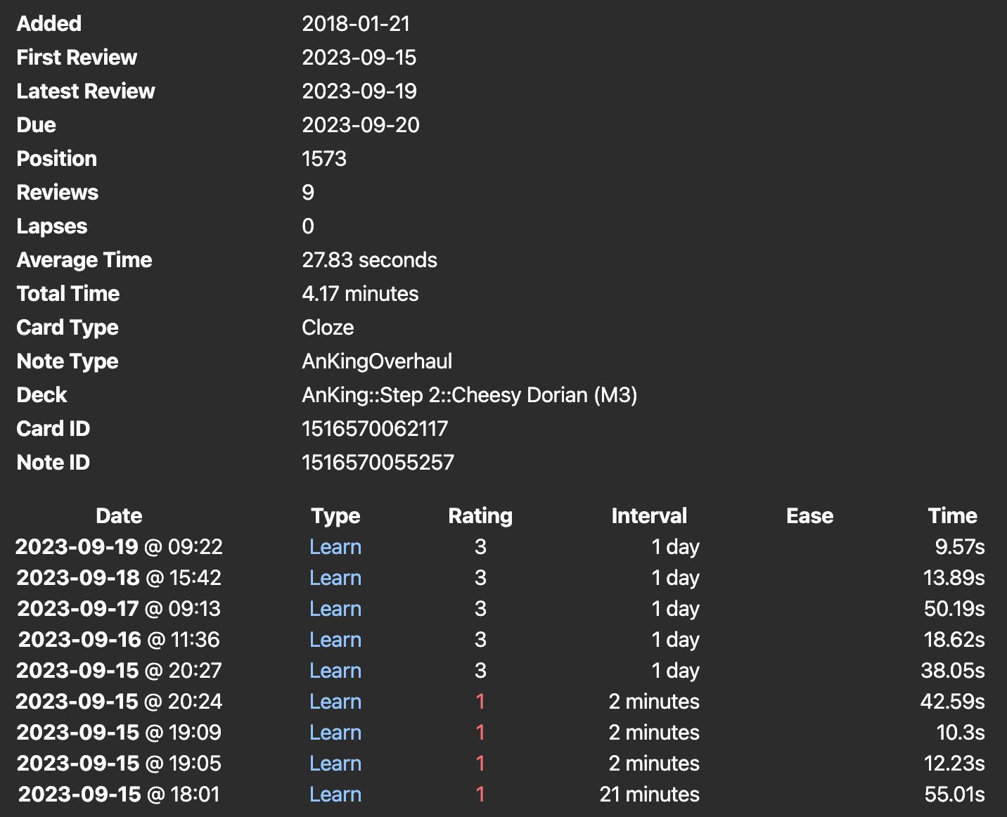This is what I mean by, “it asks me to change the options for two tags for that card.” I am not sure if this has anything to do with the issue. What I noticed is that the 25 min and 1 day setting working fine when it is in my CMED deck, but the problem occurs when it is in my Anking deck. Here is a screenshot of what I mean: