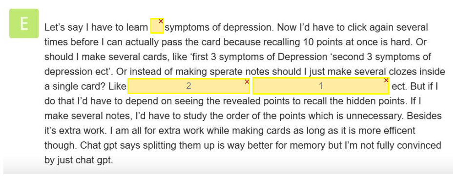 Let’s say I have to learn 10 symptoms of depression. Now I’d have to click again several times before I can actually pass the card because recalling 10 points at once is hard. Or should I make several cards, like ‘first 3 symptoms of Depression ‘second 3 symptoms of depression ect’. Or instead of making sperate notes should I just make several clozes inside a single card? Like {{c1:: first three symptoms}} {{c2:: second three symptoms}} ect. But if I do that I’d have to depend on seeing the revealed points to recall the hidden points. If I make several notes, I’d have to study the order of the points which is unnecessary. Besides it’s extra work. I am all for extra work while making cards as long as it is more efficent though. Chat gpt says splitting them up is way better for memory but I’m not fully convinced by just chat gpt.