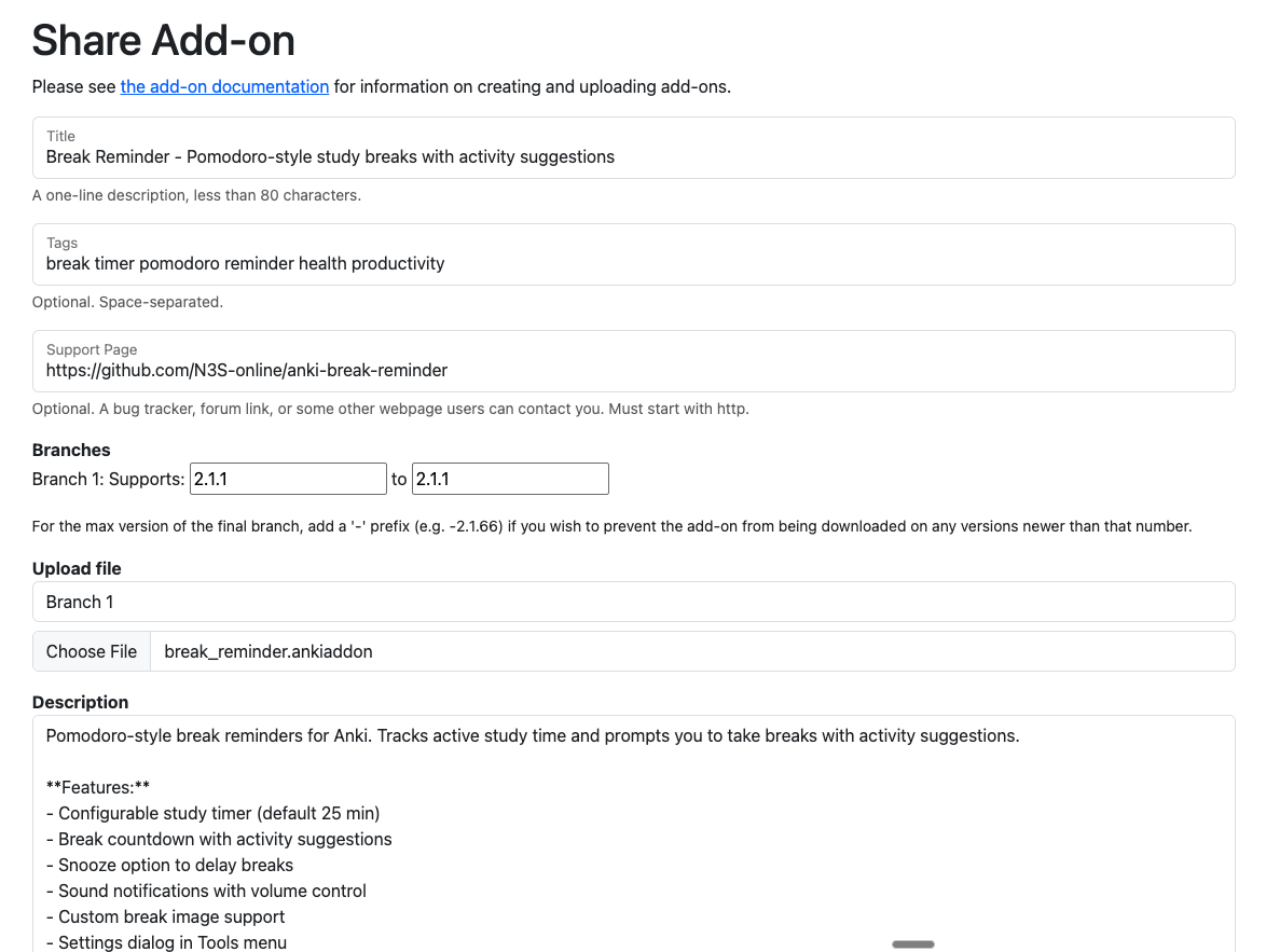 I made this add-on for my partner who is in medical school and I was trying to upload it to AnkiWeb via https://ankiweb.net/shared/upload but I keep getting a “try again later” error.