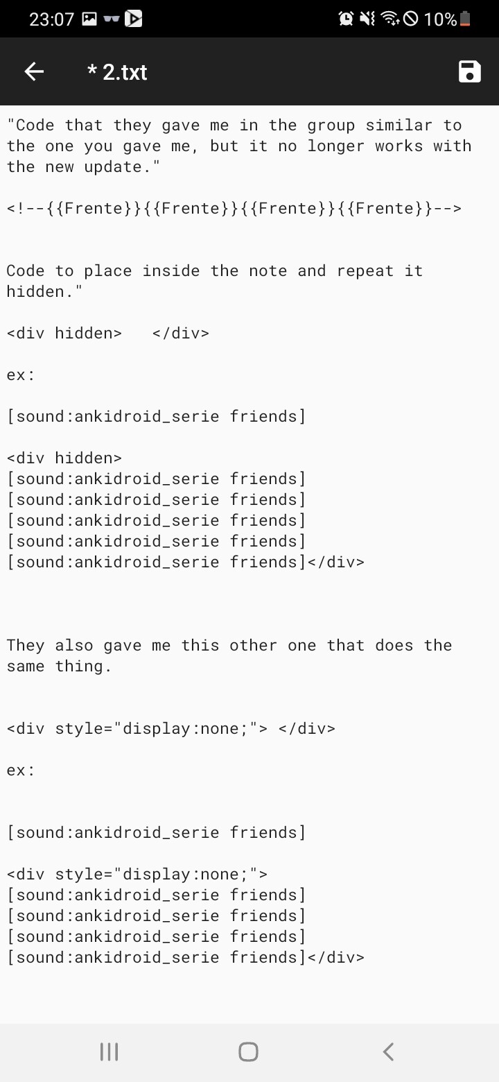 espera um momento..Agora sobre os códigos.Tentei pesquisar no manual do anki exatamente o codigo que você me deu,e não achei ele lá. Esse código que você me deu não é um codigo feito pelo anki,é?Éum código feito por você?Podemos inventar códigos para coisas que queremos fazer no anki?