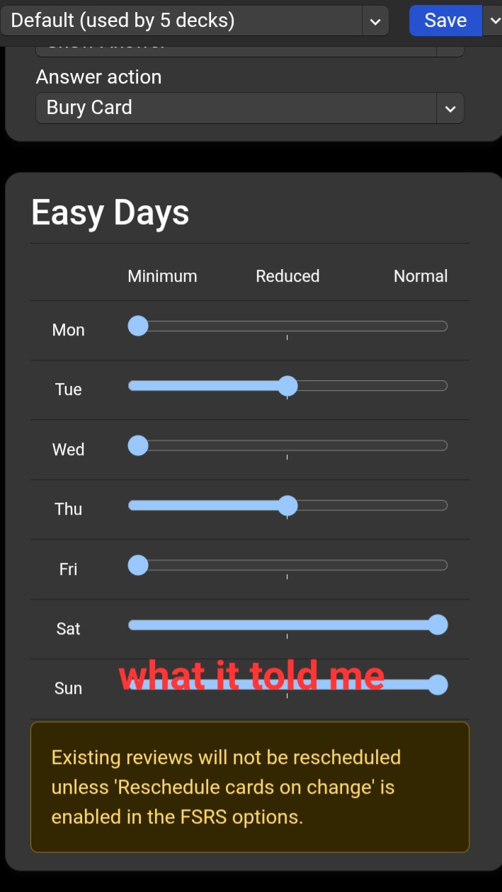 I was trying to reduce the load on some days so I put reduced and minimum on some days. It told me it wouldn’t reschedule right away unless I turned on FRSR and one of the options on there, I turned it on and saved the settings, it didn’t do anything, so I figured if I turned it off it would reschedule the next day. So the next day I open the app and the load is slightly more than usual, I felt lazy and didn’t feel like doing that much today, so I went to the settings again. I turned on FRSR and put minimum for this day. I saved the settings and checked my decks (2) and they were at 20 new cards each. 0 review cards for one of them and only 1 for the other.