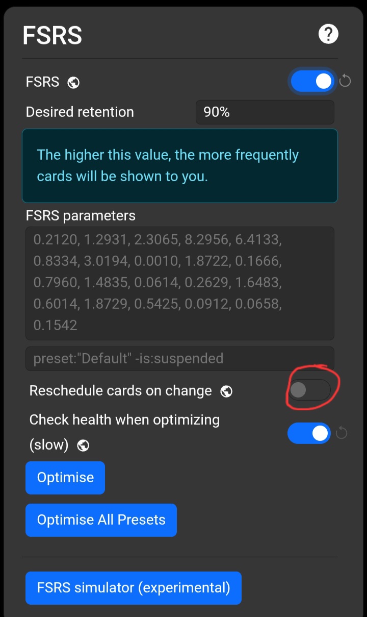 I was kinda dumb and didn’t think minimum meant this. I realise now that I don’t want it to be at minimum gor any days, or reduced probably either. I tried to change the settings and turned off FRSR like 10 times, it didn’t fix anything (I would put all the days normal and turn FRSR on and off). Also something I thought was strange was that the Reschedule cards on change option would appear as turned off everytime I opened the settings again. I have no idea how to change my settings to what they were before or default since that’s what they were.
