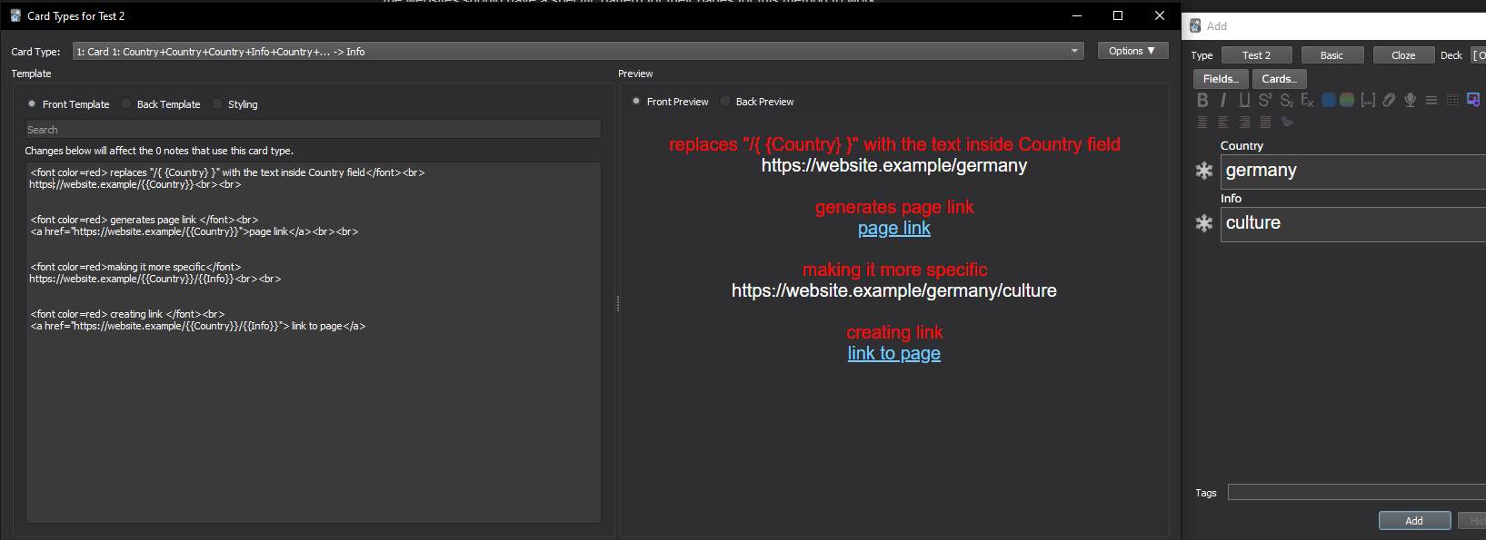 so if you have a field that holds the country name, you can put https://en.wikipedia.org/wiki/{{FIELD NAME}} in your card template and the country name at the end of the link will change based on the name that is stored in FIELD NAME